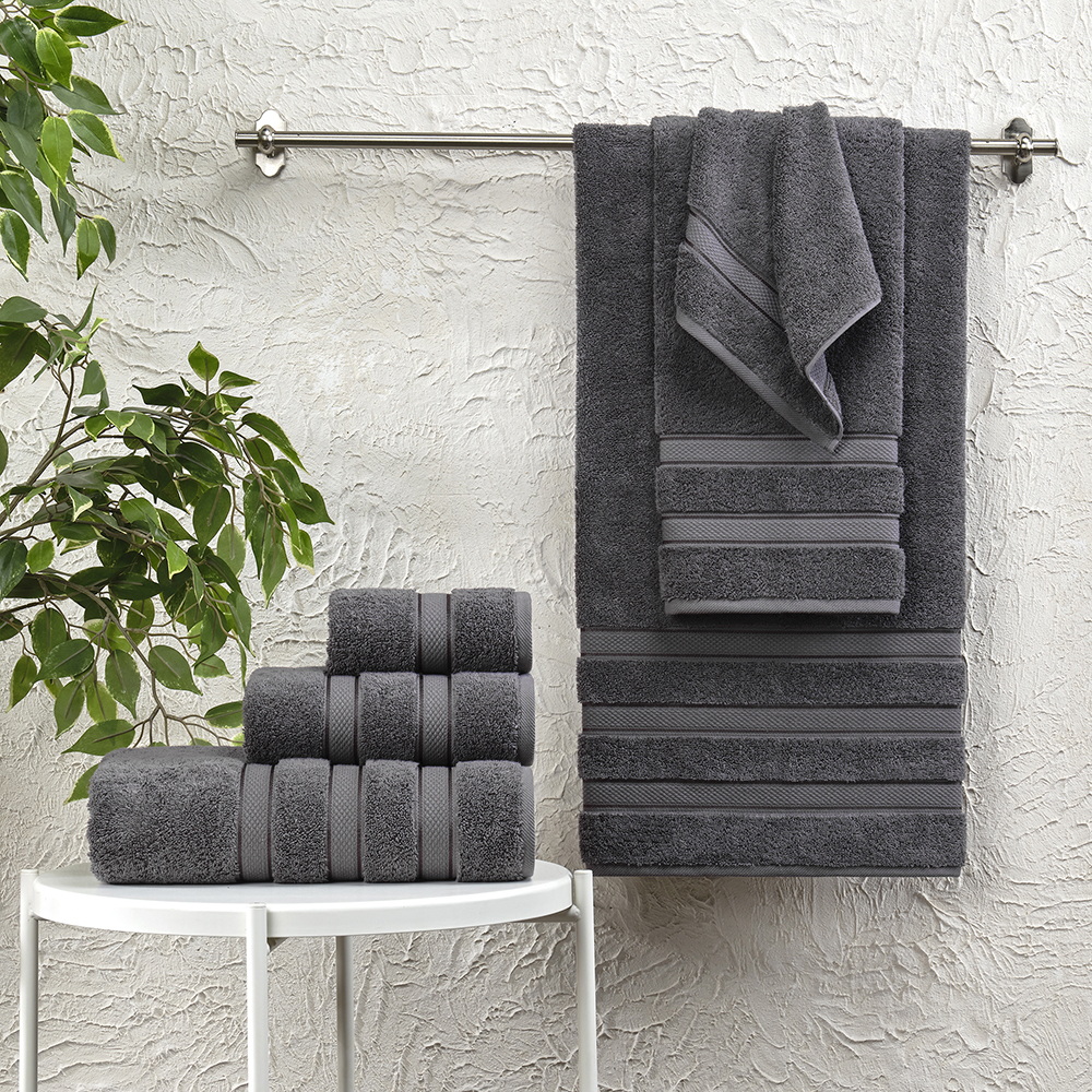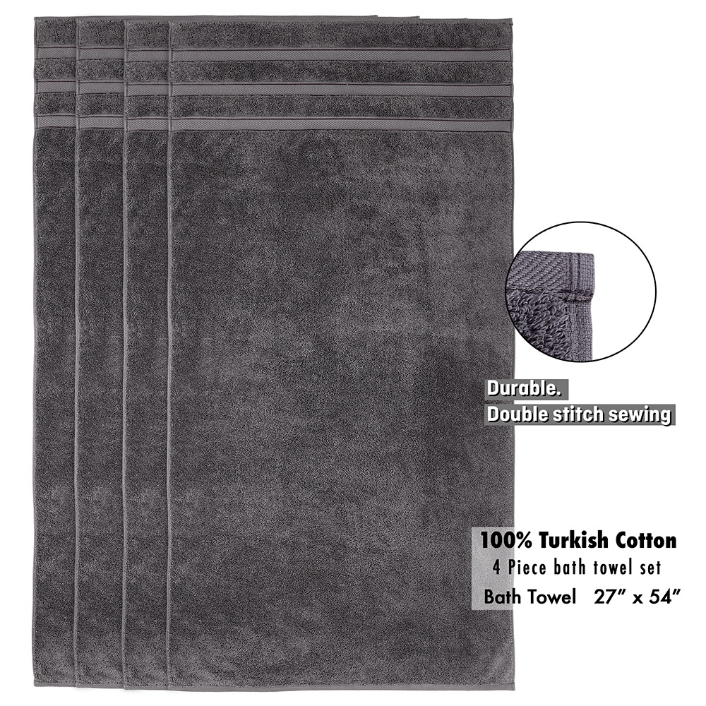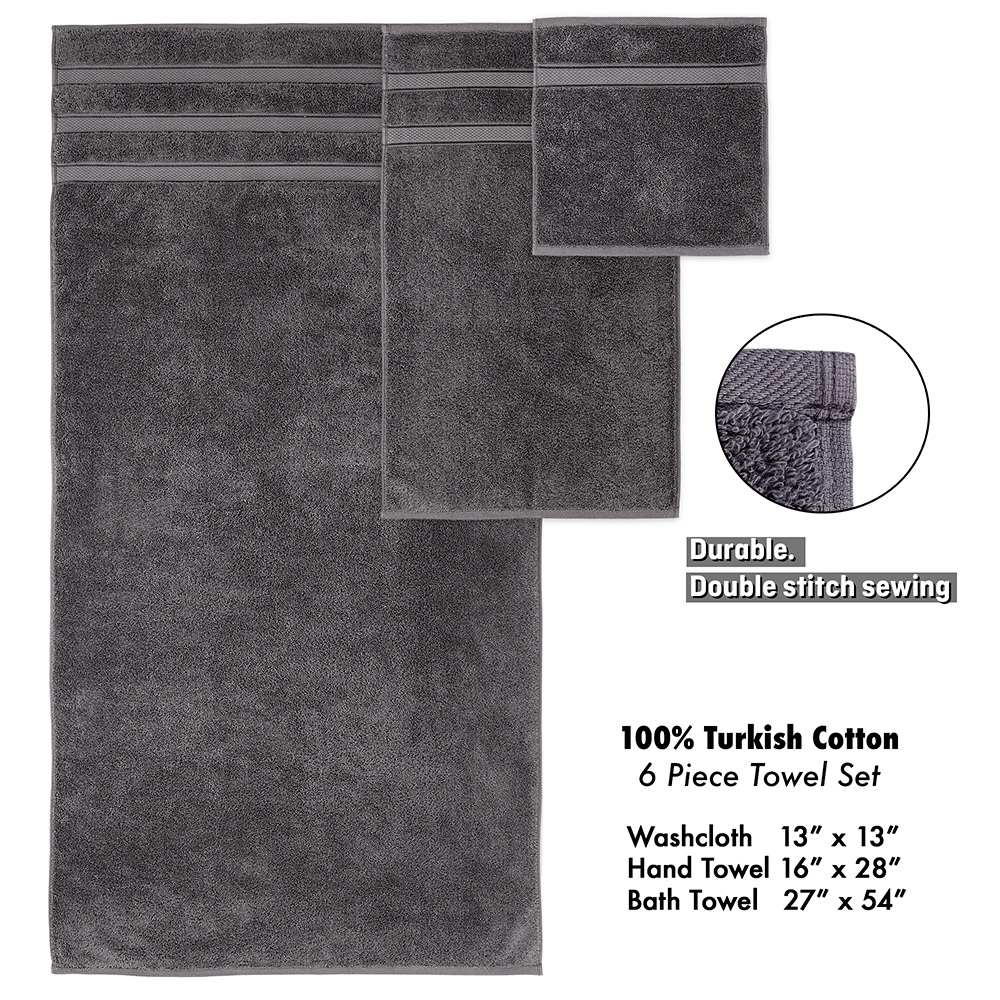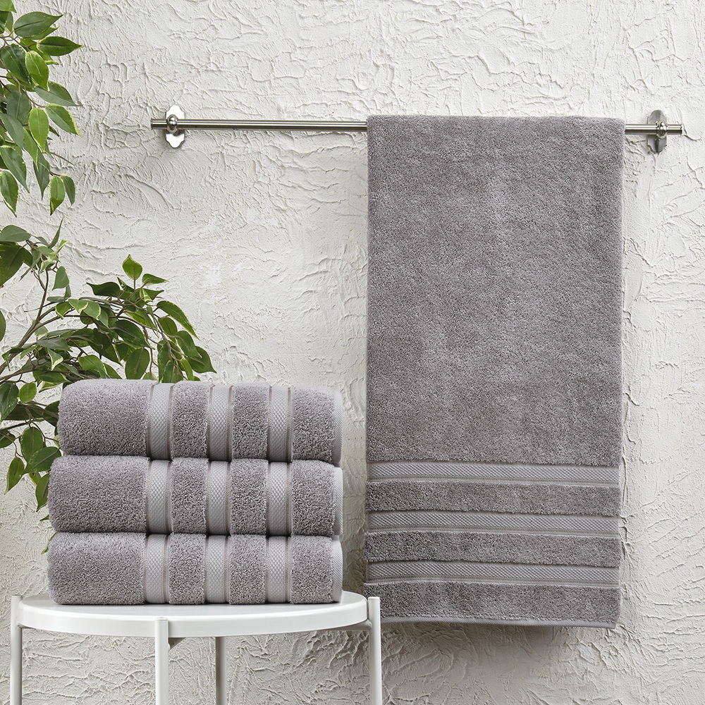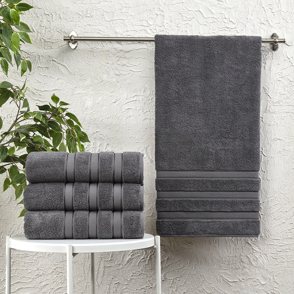 "This towel set is great! They are very soft and washed well. I love that they are a bigger size. They wrap around me perfectly. I love the dark gray color, it matches my bathroom perfectly."